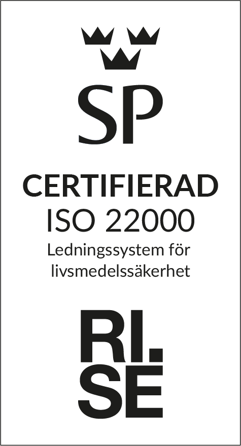 Våra produkter håller både hög kvalitet och god livsmedelssäkerhet. Vårt ledningssystem är certifierat enligt ISO 9001 för kvalitet, samt ISO 22000 för livsmedelssäkerhet. Vi är även certifierade enligt Normpack-normen.
