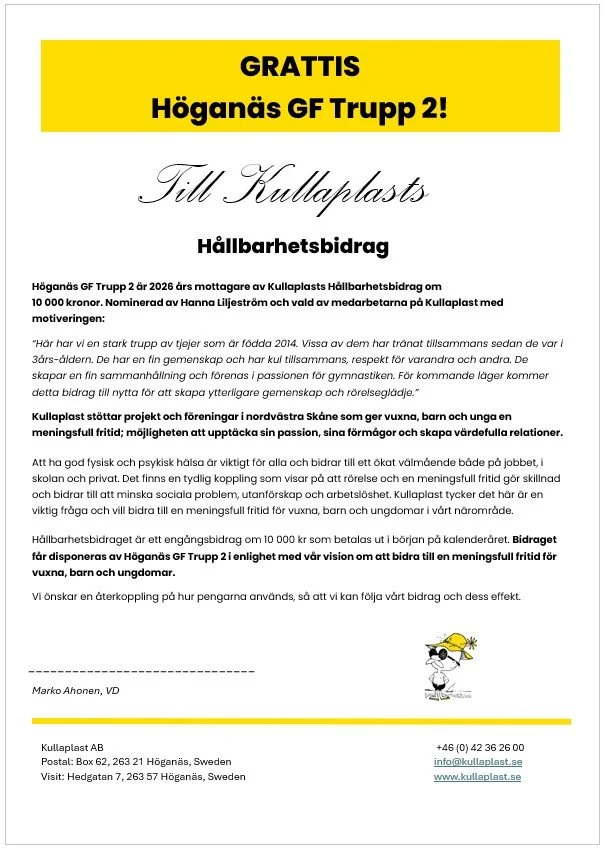 På Kullaplast har samhällsengagemang länge varit en naturlig del av vår identitet. Sedan början av 2000‑talet har vi bidragit med närmare en miljon kronor till cancerforskning och till initiativ som stöttar utsatta barn, både i Sverige och runt om i världen.